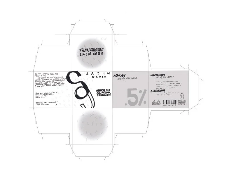 I began with sketching any and all logo/ branding ideas. Making associations with the literal terms of the brand; “satin” and “glass”. Below are first draft sketches of possible packaging ideas that developed into the final iterations seen above.