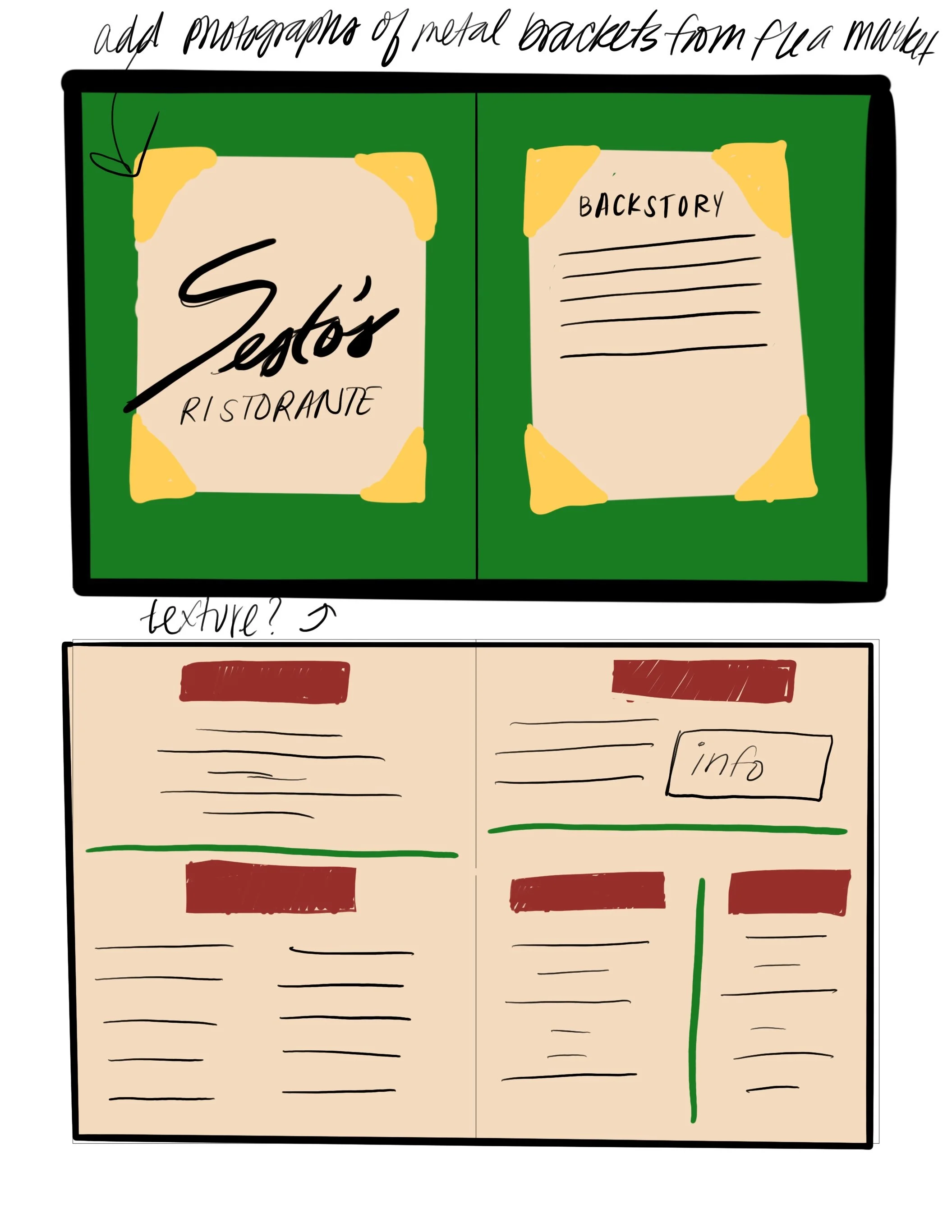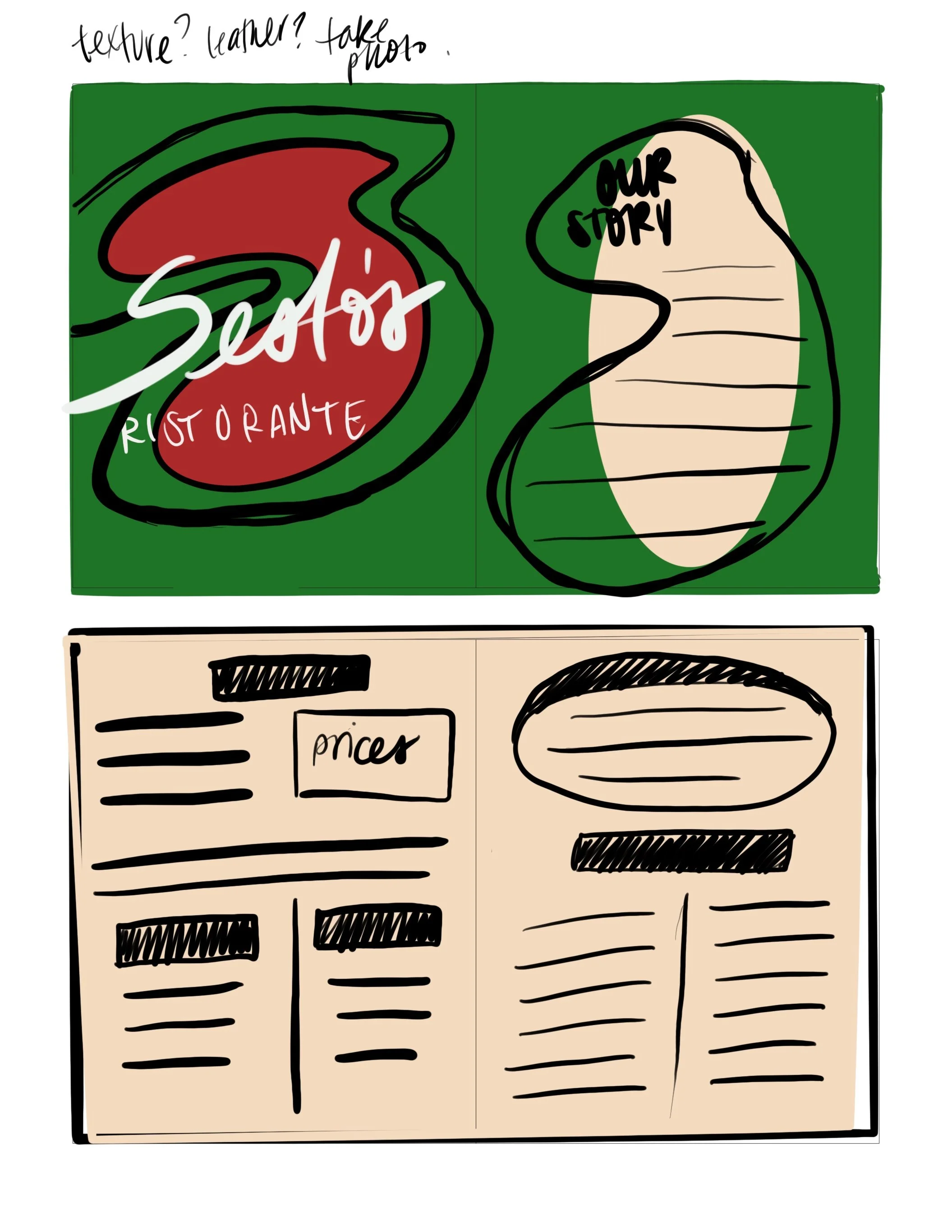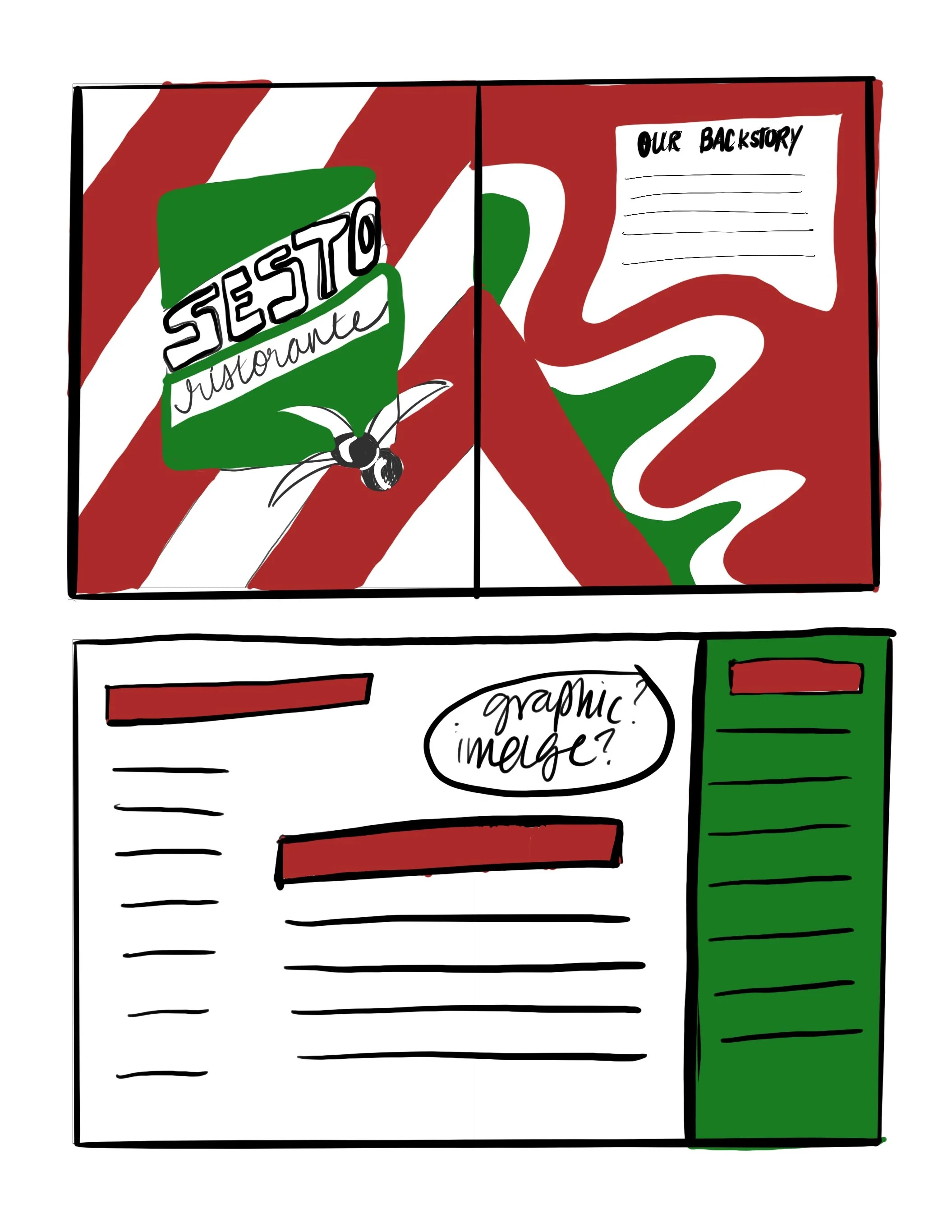 My first thought was to incorporate the colors of the Italian flag, commonly associated with Italian cuisine. I aimed to strike a cord between vintage and modern while keeping a structurally sound layout that adheres clearly to a grid. Research for this project included creating an original group of menu items and comparing visuals of other restaurants including their visual brand identities and menu layouts.