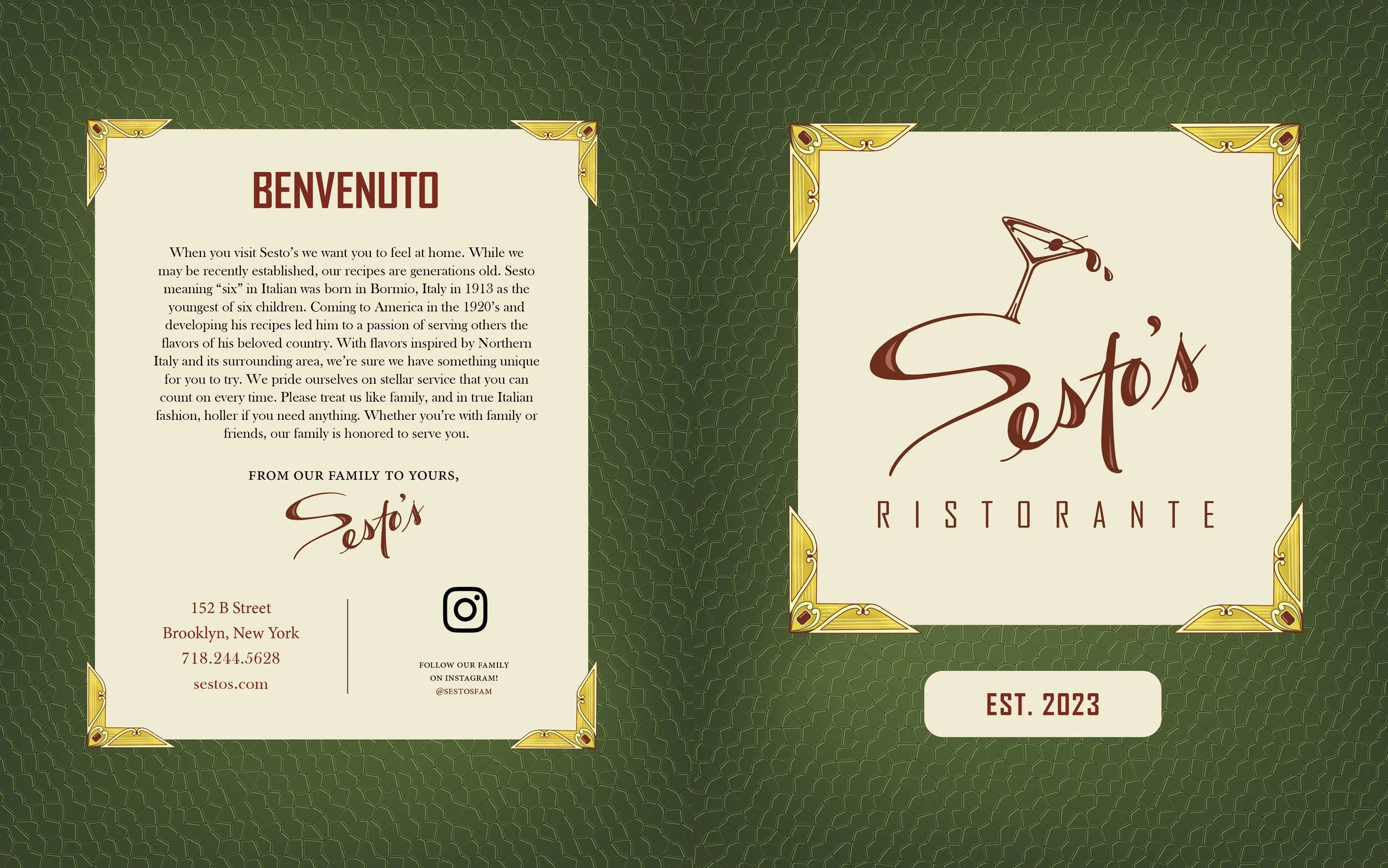 This menu design uses a minimal layout and generous white space to create a refined, upscale dining experience. A classic Italian color palette grounds the design in tradition, with olive branch accents furthering the idea. The hand-lettered logo introduces a personal, familial touch. Together, these elements strike a balance between elegance and warmth, inviting guests into a space that feels both elevated and heartfelt.