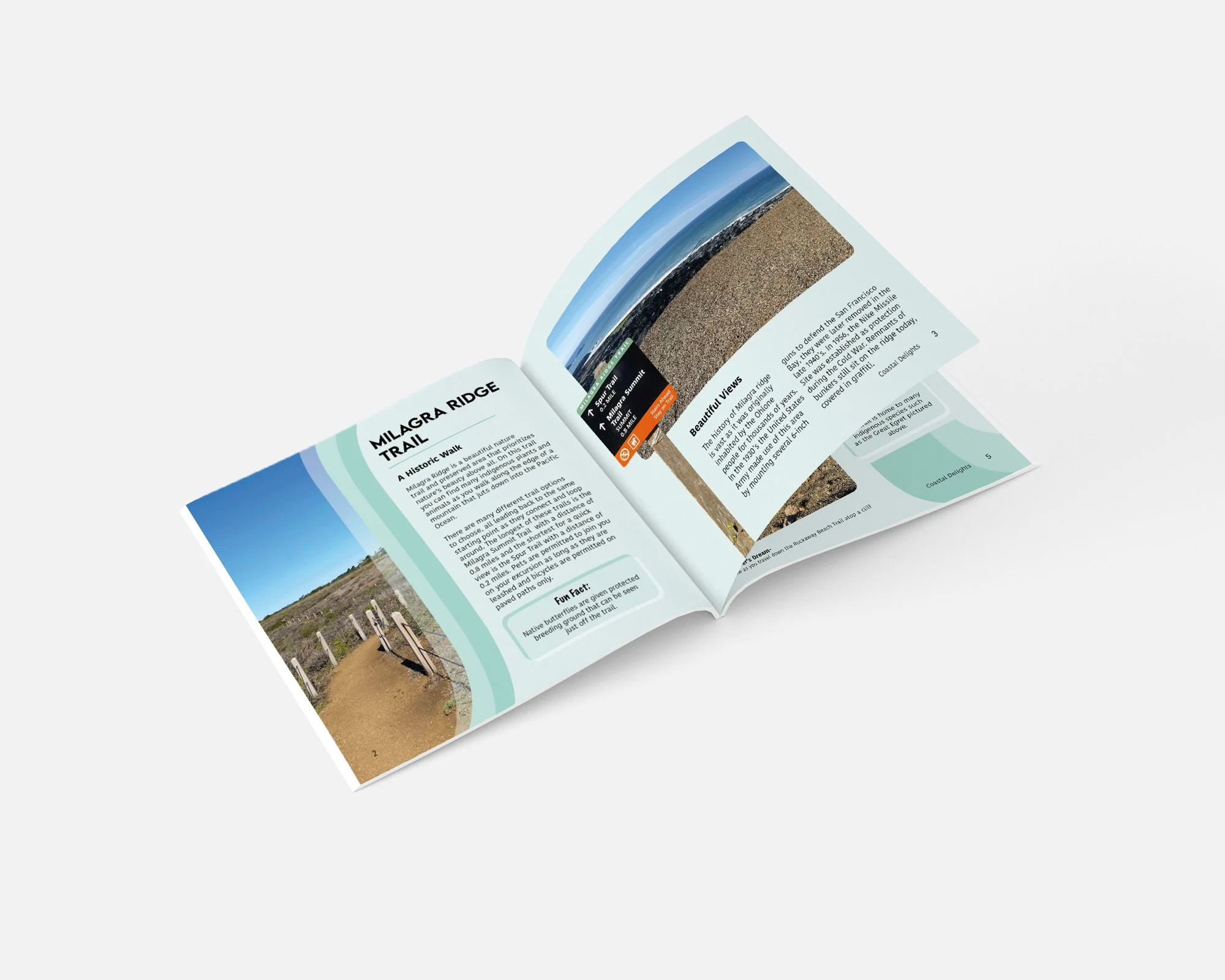 Created out of my passion out of the small beach town of Pacifica, California this booklet provided me the opportunity to combine photography, typography, and layout design to create an information booklet. Intended to guide a gorgeous day, this booklet could be a useful pocket guide to hikers and locals alike. With information such as history, amenities, and activities this guide becomes a useful tool. During this project I was able to experience the importance of color and document specifications needed when producing documents to be printed and bound.